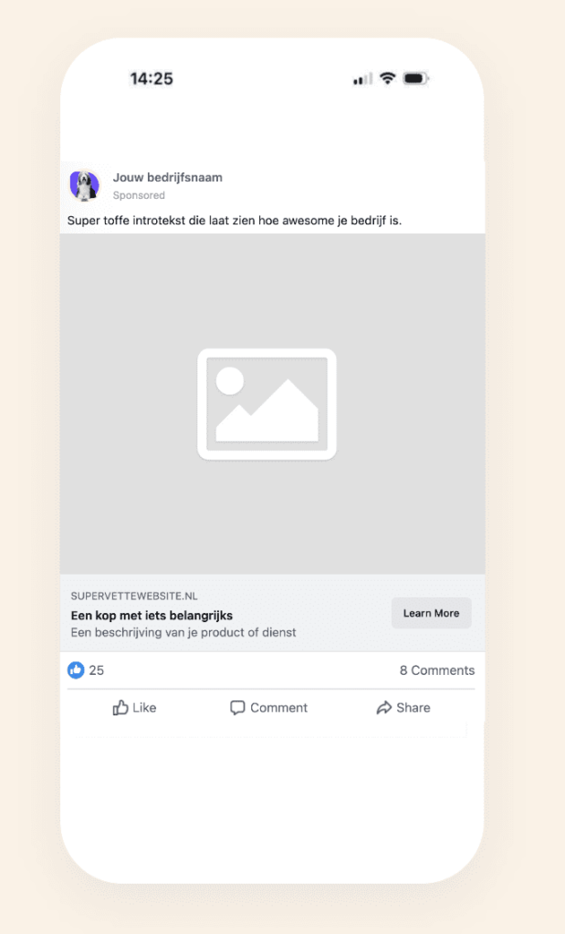 - Banners: je hebt visuals nodig voor een social media campagne. Je kunt deze zelf maken met bijvoorbeeld Canva (hier vind je ook templates voor social media advertenties) of je kunt ervoor kiezen deze te laten maken door bijvoorbeeld een grafisch vormgever.